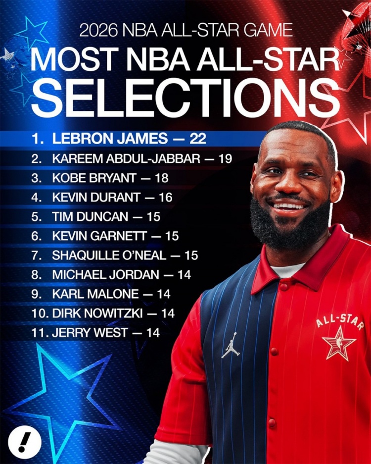 入选全明星总次数!詹姆斯22次扩大领跑优势 KD第4 乔丹并列第6